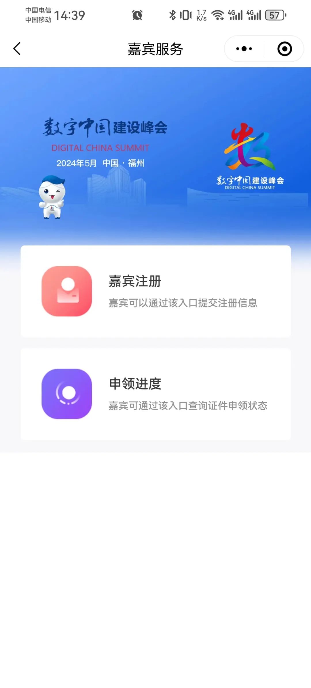 1.扫描下方小程序码,进入数字中国建设峰会小程序选择“开幕式嘉宾”,填写信息进入参会信息填写页面。