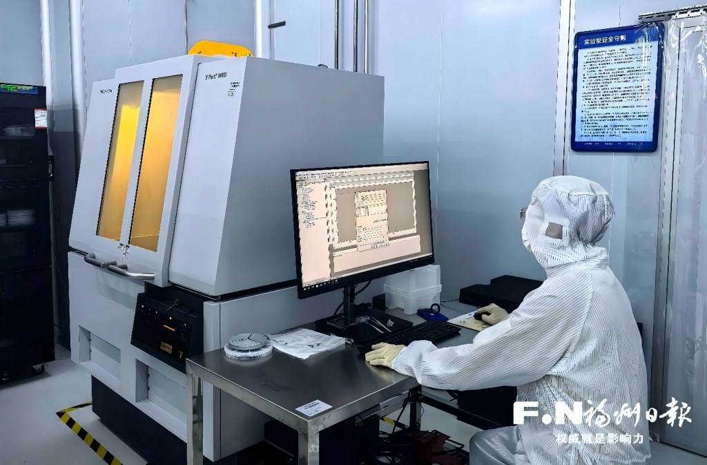闽都创新实验室的半导体无尘车间内,科研人员在测量晶圆参数。记者 赖志昌摄