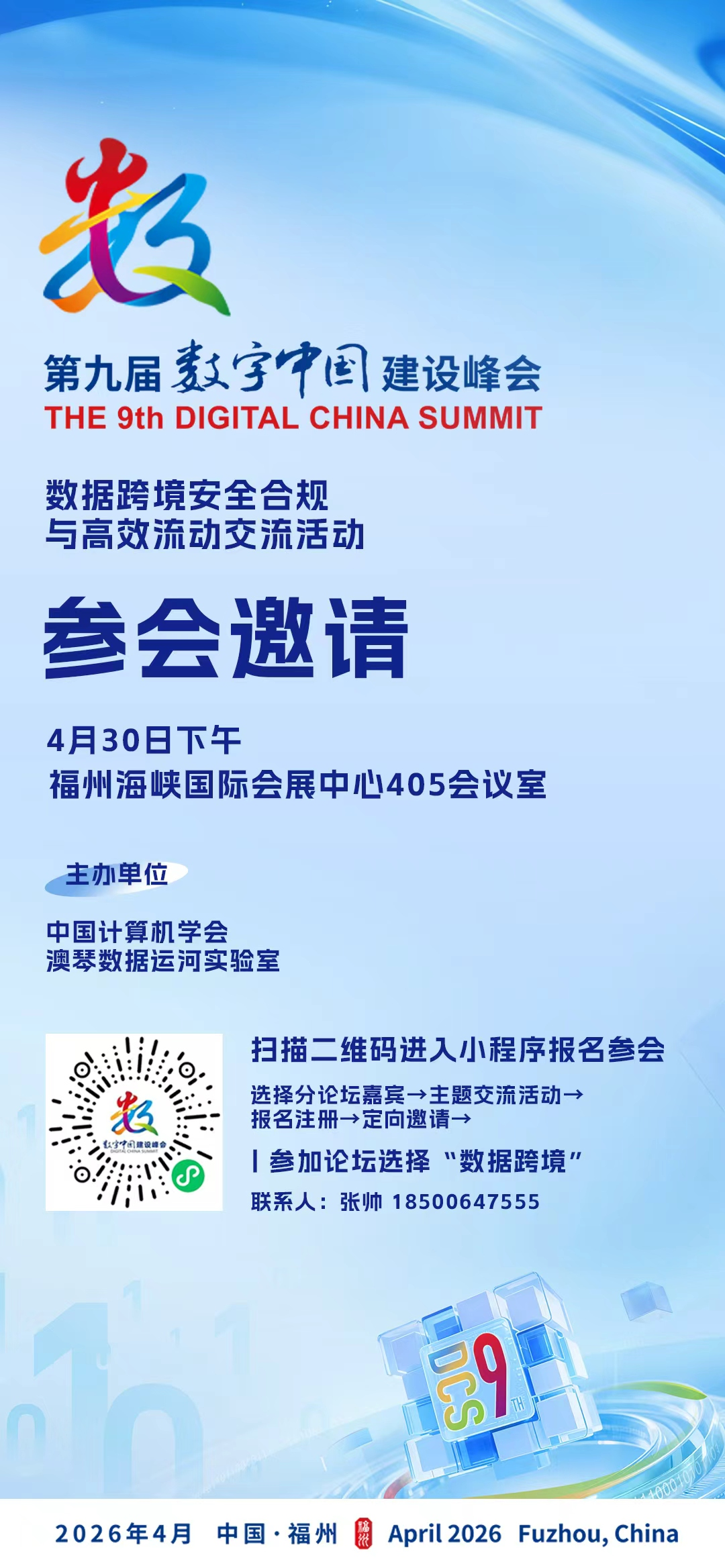 中国计算机学会联合澳琴数据运河实验室,将于第九届数字中国建设峰会期间(4月30日下午),在福州海峡国际会展中心405会议室举办“数据跨境”主题交流活动。