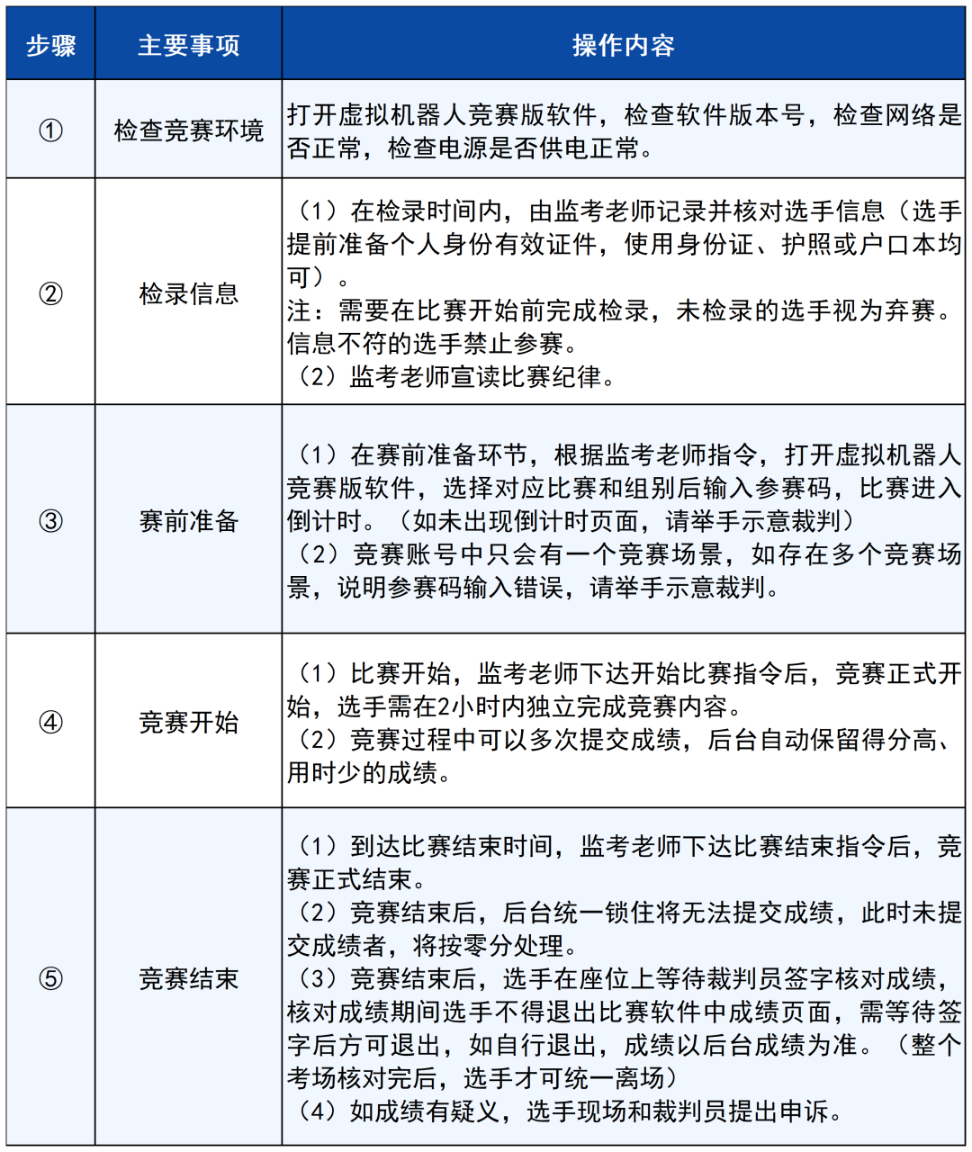 竞赛流程分为5个主要环节,分别为检查竞赛环境、检录信息、赛前准备、竞赛开始、竞赛结束。