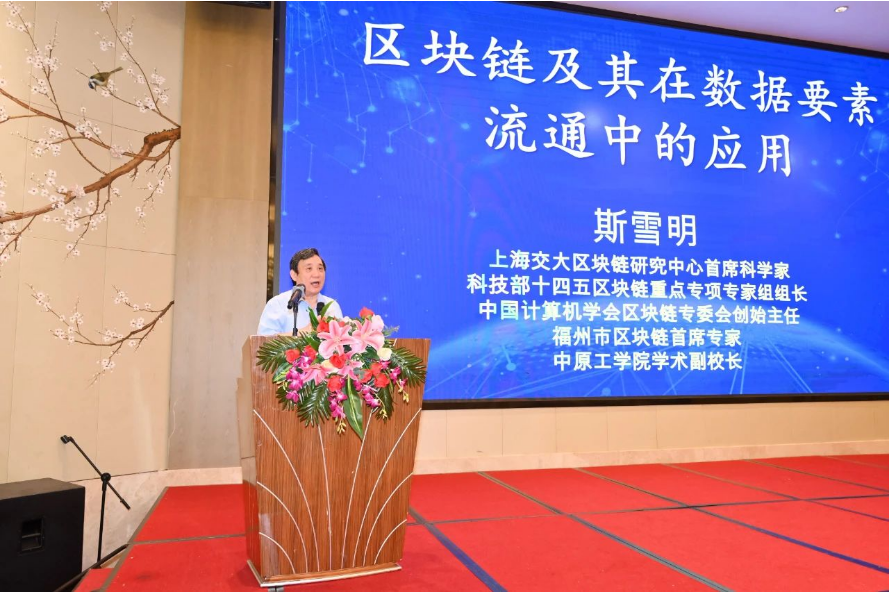上海交大区块链研究中心首席科学家、科技部“十四五”区块链重点专项专家组组长、福州市区块链首席专家斯雪明介绍了区块链的发展背景、挑战与机遇,以及区块链在数据要素流通中的应用情况,并针对区块链在数据入表、数据登记等过程中的应用价值做了重点分析。他指出,数据要素流通与区块链密不可分,区块链技术在数据治理、数据确权、数据监管、数据安全和数据隐私等领域具有突出的应用价值。